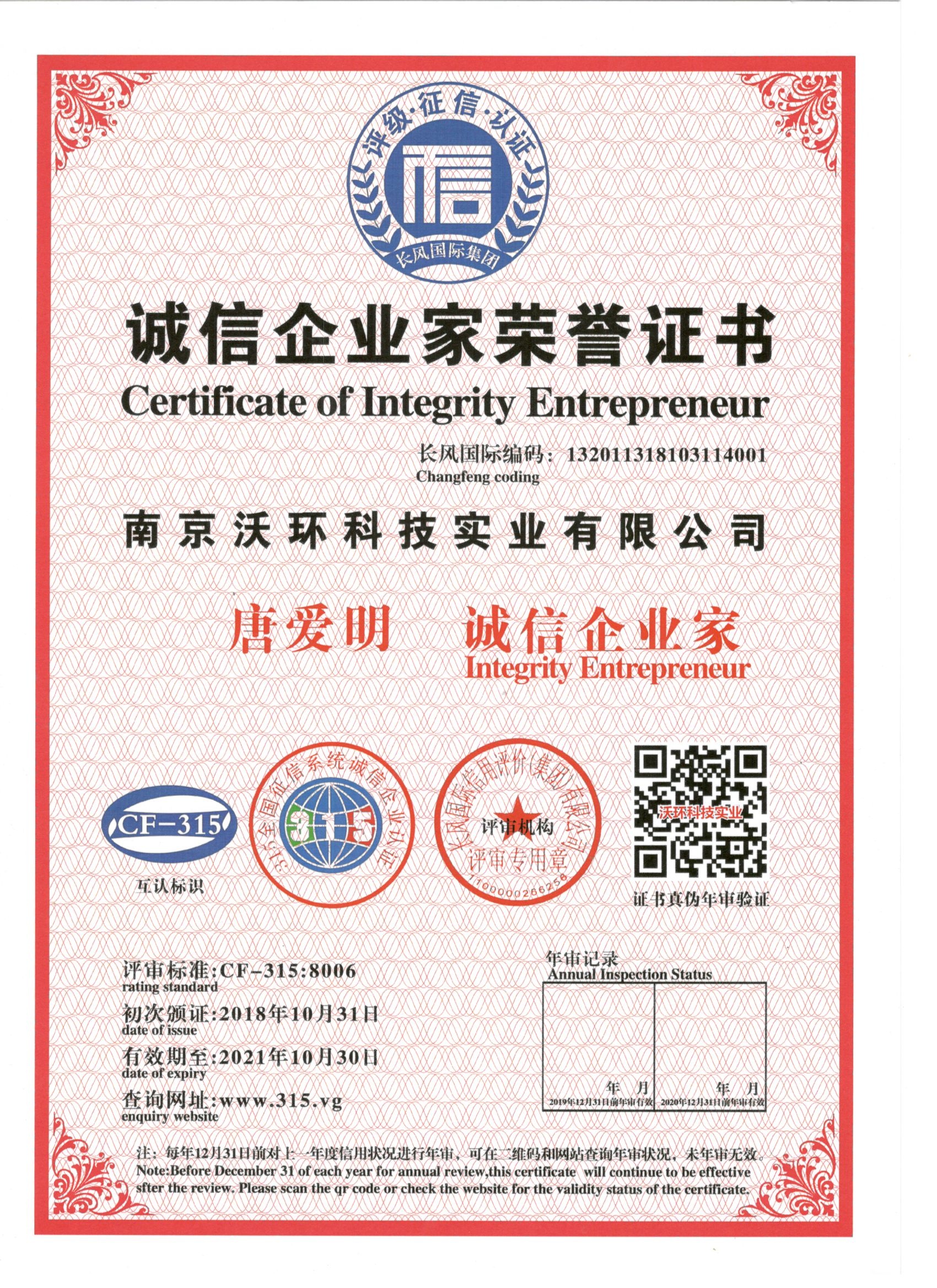 熱烈祝賀南京沃環(huán)公司唐愛明先生被專業(yè)評審機構-長風國際集團評為誠信企業(yè)家,特發(fā)此證書