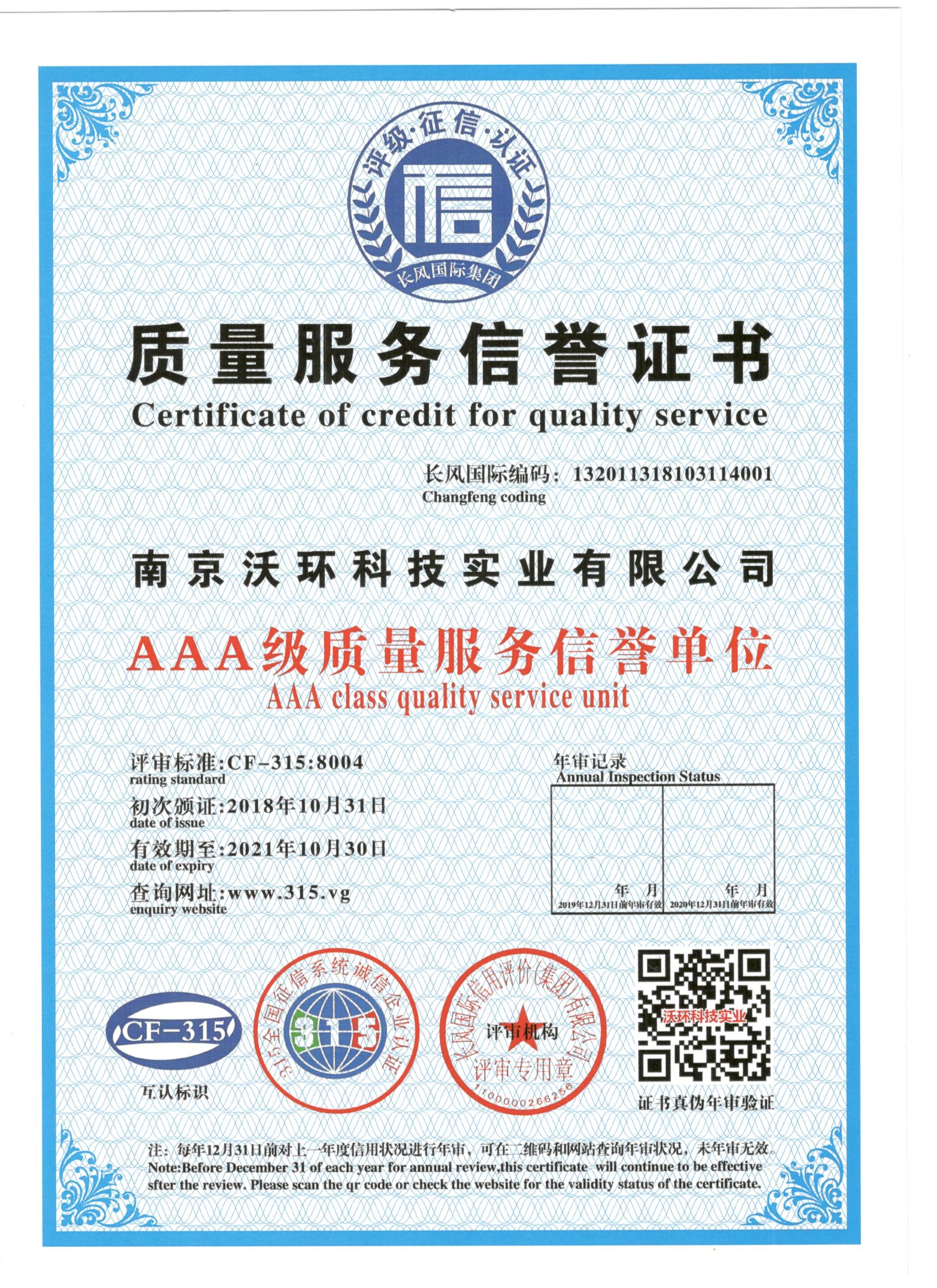 熱烈祝賀南京沃環(huán)公司被專業(yè)評審機構(gòu)-長風國際集團評為AAA級質(zhì)量服務信譽,特發(fā)此證書